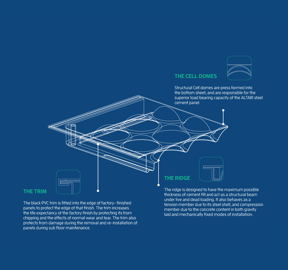 Resistance welds between the top sheet and the bottom sheet as well as the edges in one hundred locations ensures the monolithic structural performance of each ALTAIR steel cement panel.